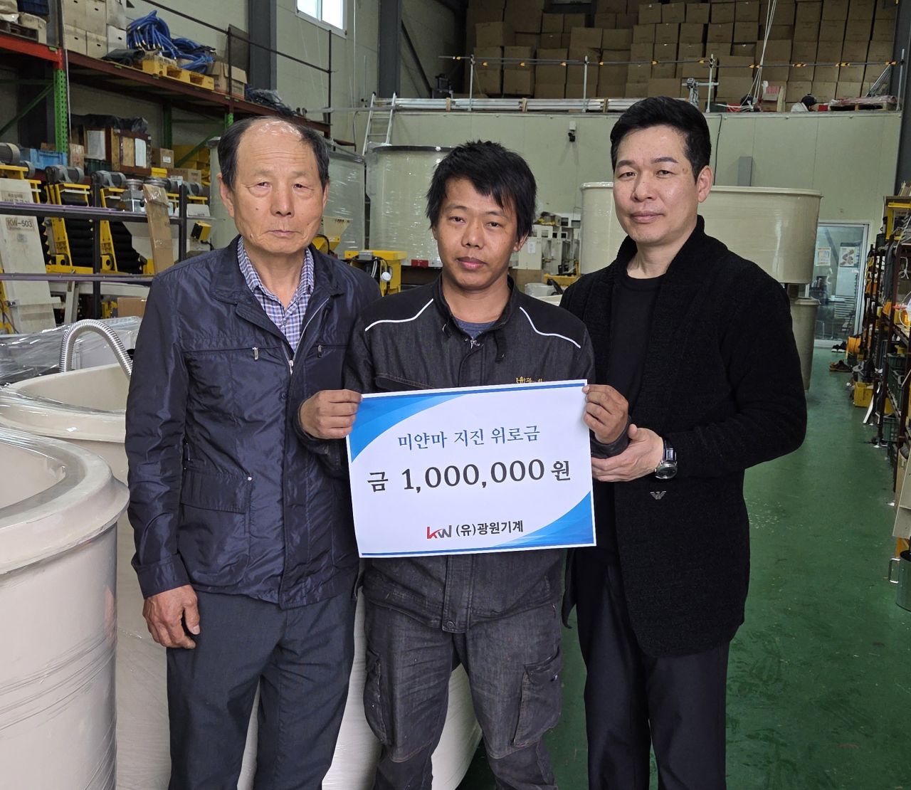 유한회사 광원기계(대표 정경수·김영태)가 최근 미얀마 지진으로 피해를 입은 외국인 근로자에게 위로금을 전달해 귀감이 되고 있다.